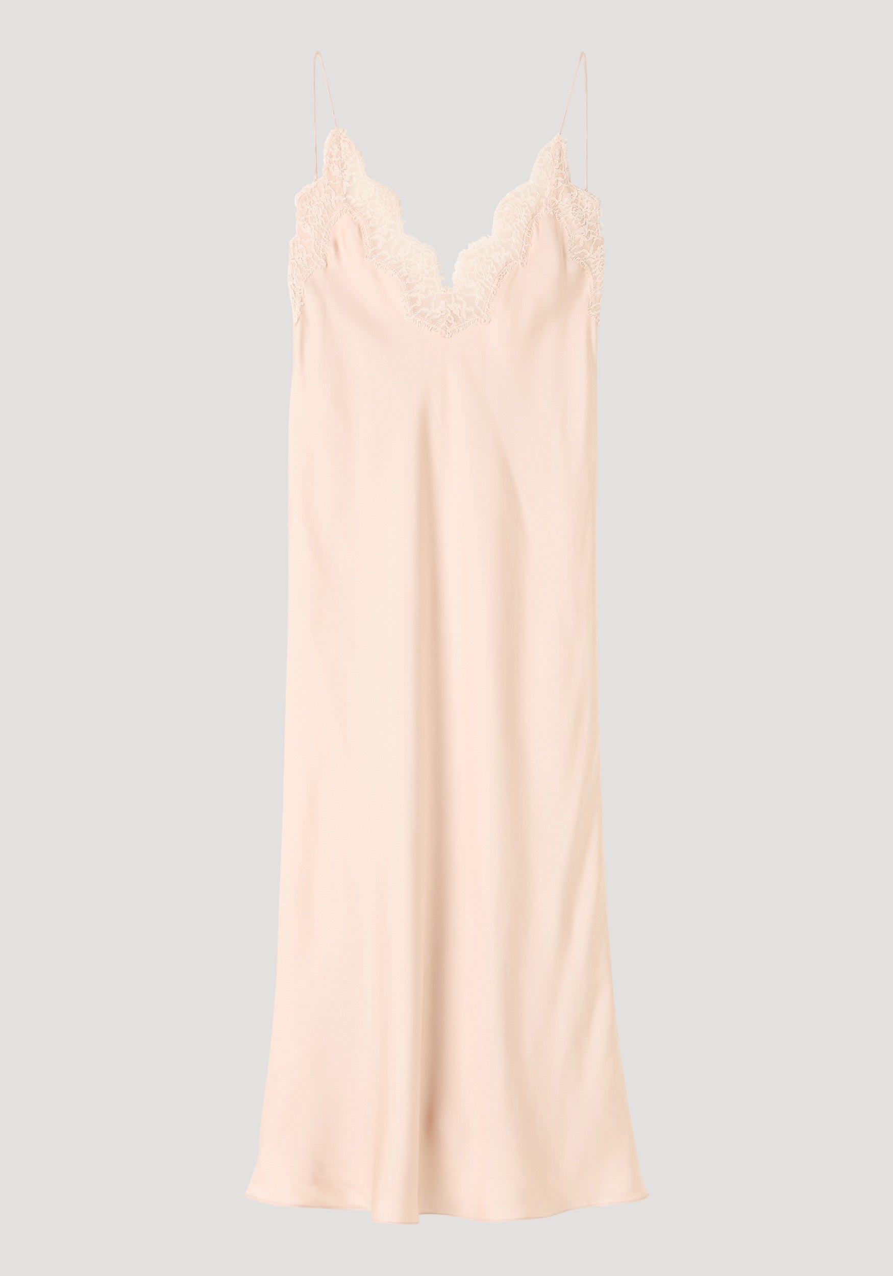 A lightweight silk camisole slip dress featuring delicate lace detailing along the neckline and back, finished with elongated adjustable straps that fall down the back of the garment.