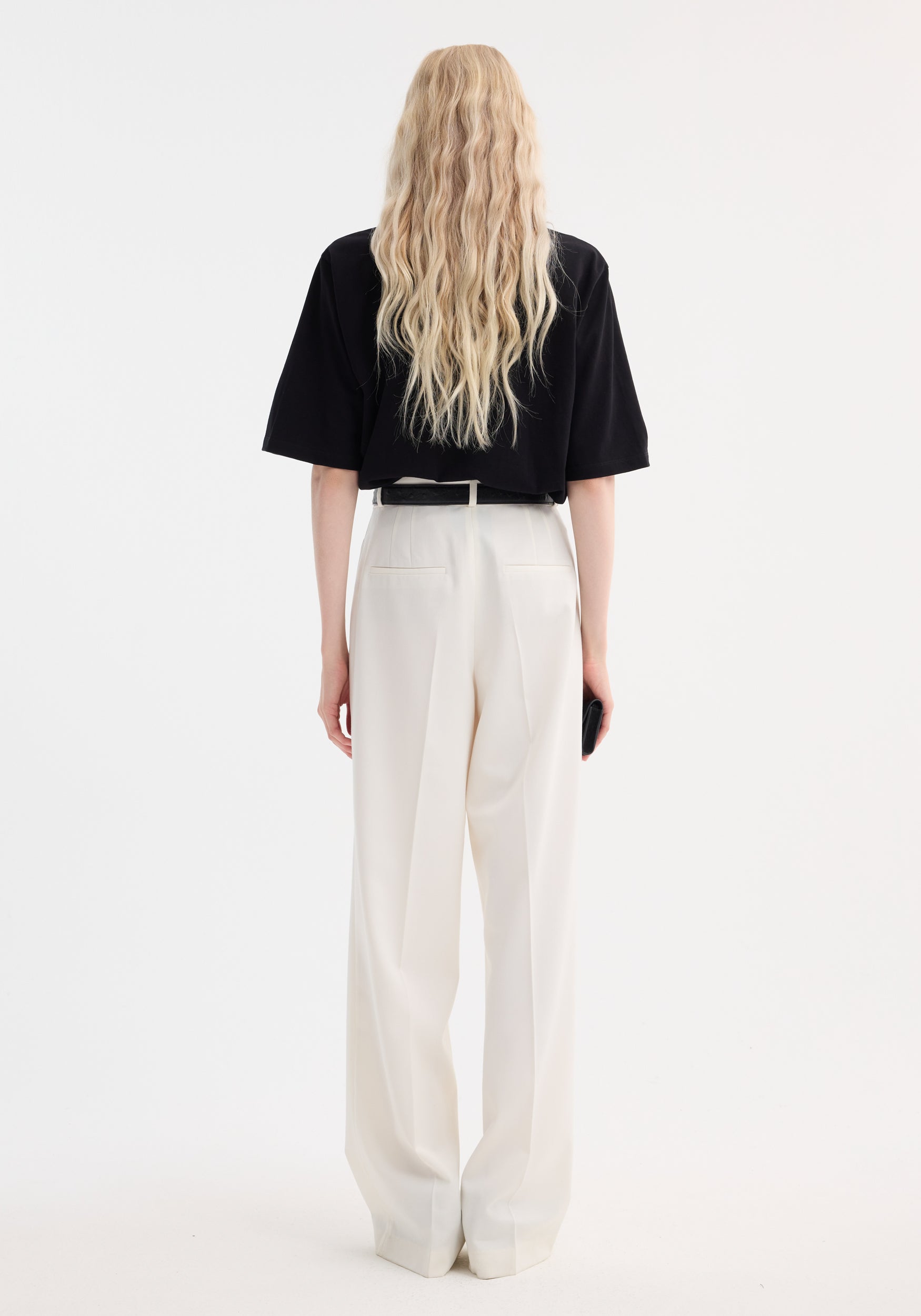 Introducing our classic mid-waist tailored trousers in a stunning soft off white wool blend fabric. With a tailored waistband, sharp double pleats and a flattering wide leg.