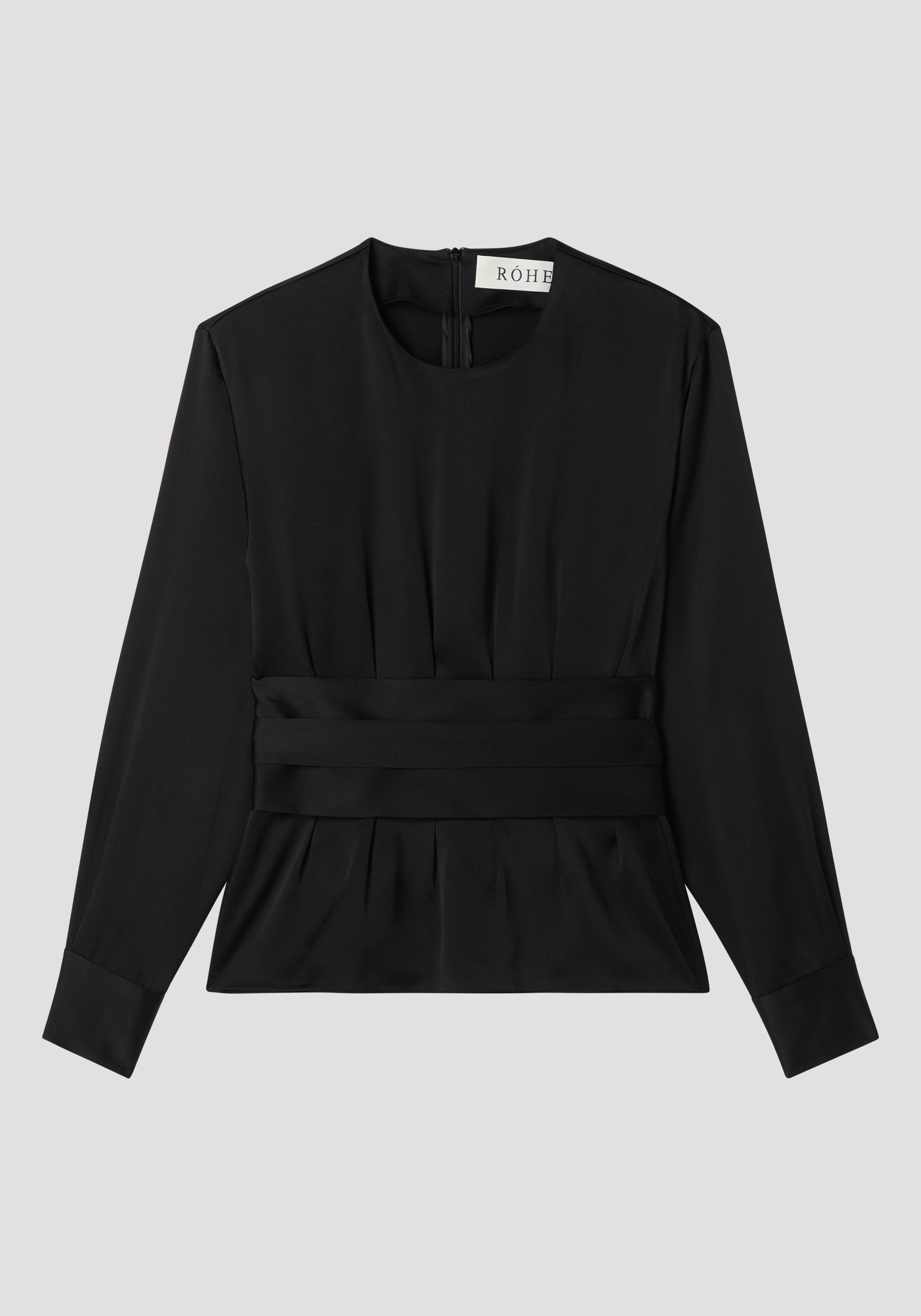 An elegant interpretation of kimono-inspired dressing, this satin top features a refined round neckline and fluid long sleeves. Crafted in a luminous satin with a soft drape, it is cinched at the waist with a wide tonal sash designed to wrap and knot effortlessly.