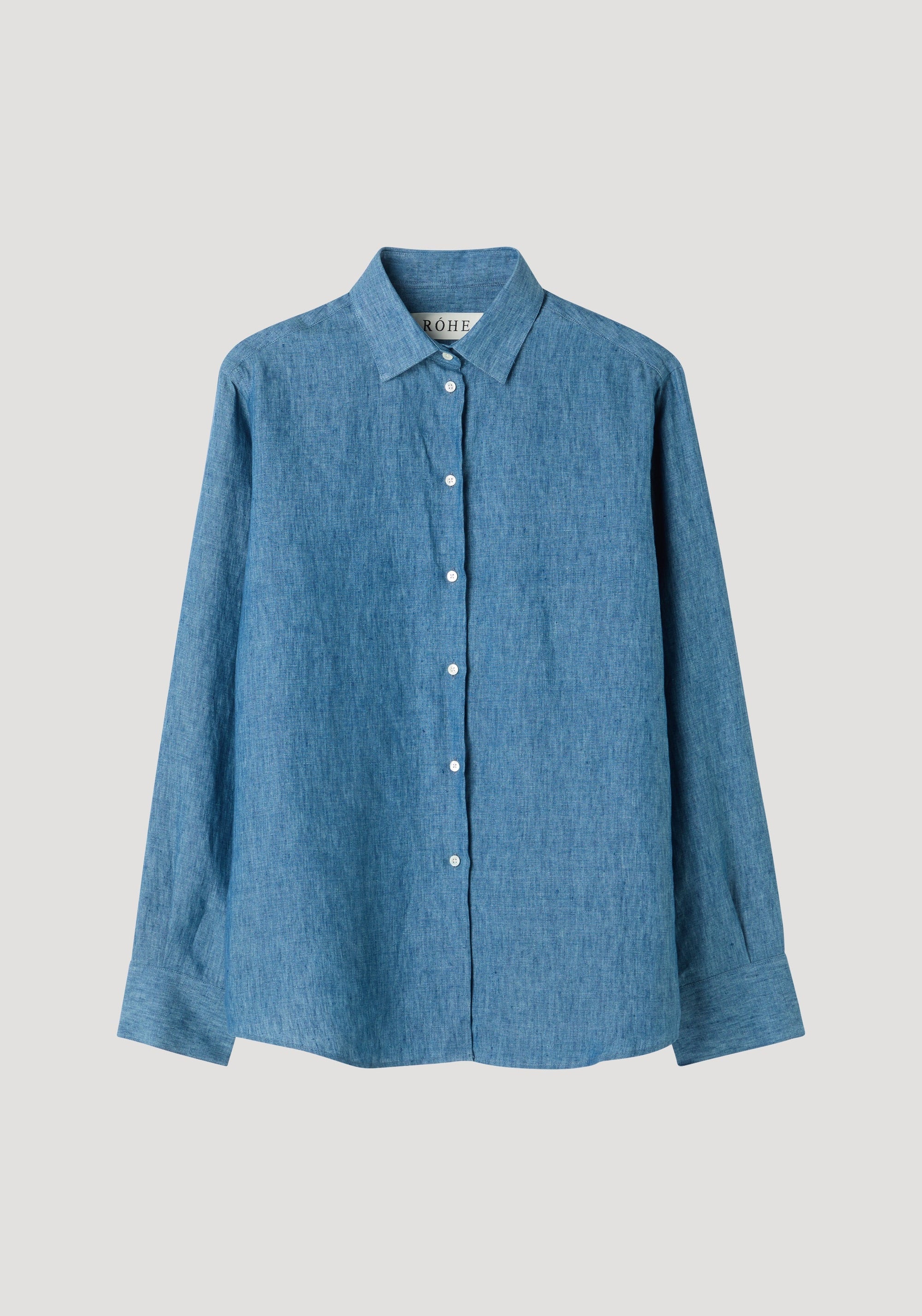 A classic shirt cut from breathable blue chambray linen with a soft washed delavé finish. Designed with clean lines and a relaxed fit, it pairs effortlessly with the matching wide-leg pyjama trousers for a coordinated set.