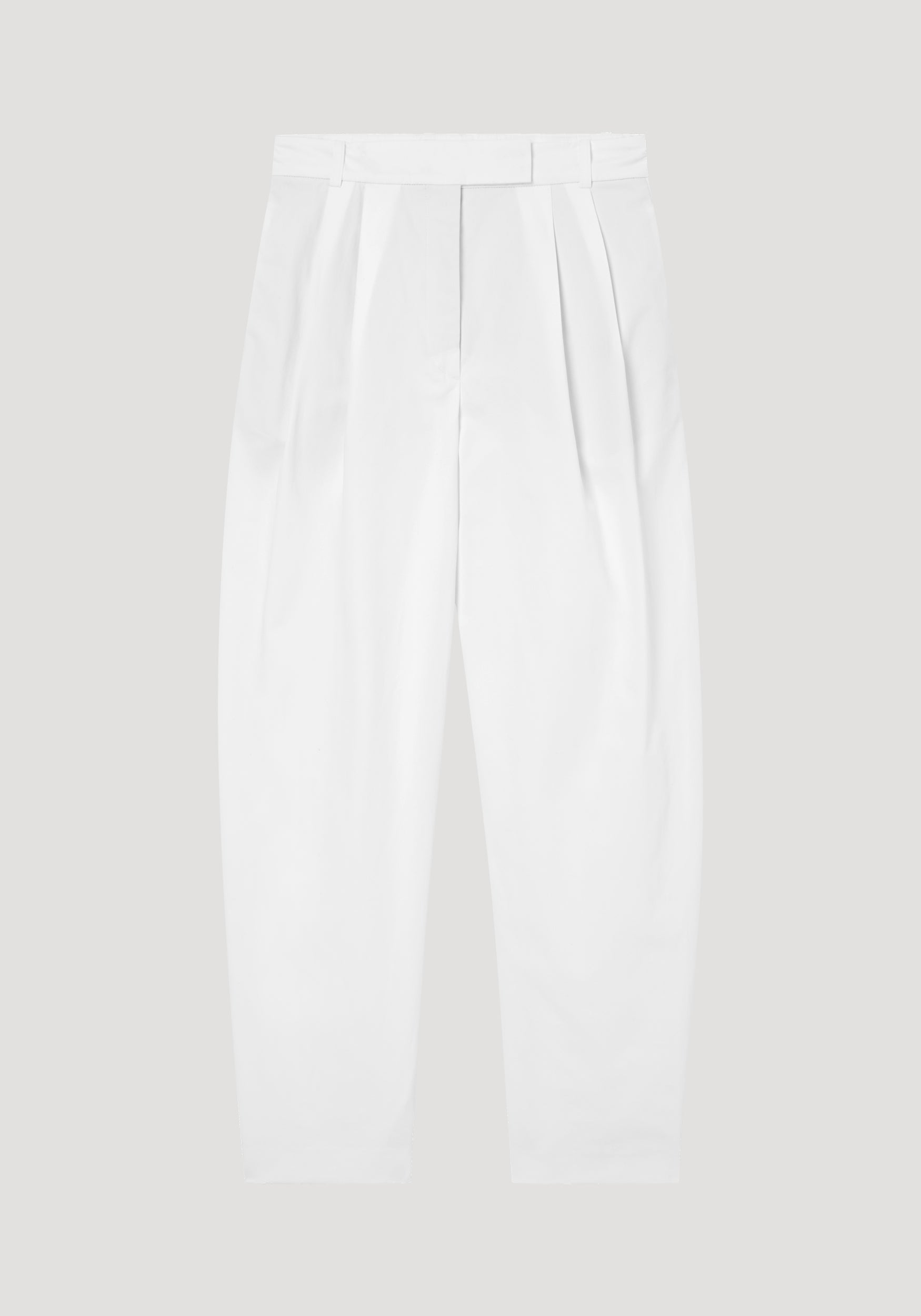 Crafted from a clean cotton fabric, these high-waisted trousers feature a round barrel leg silhouette and double pleats for a structured yet relaxed fit. In a crisp white cotton with slanted side pockets and welt pockets at the back to provide functional detailing.