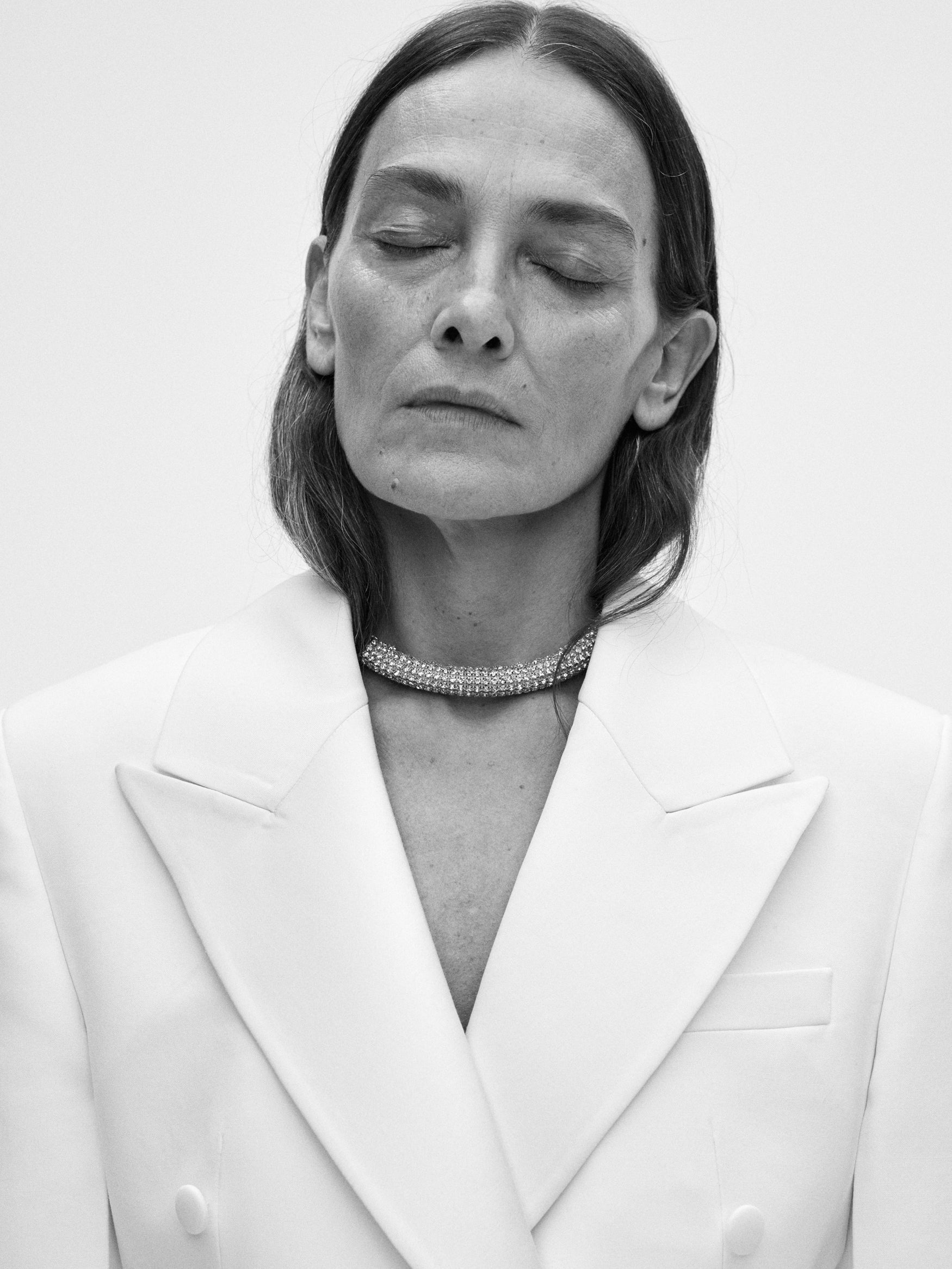 Woman wearing a white outfit consisting of a jacket with mandarin closure and a wide leg white trouser, on a plain background