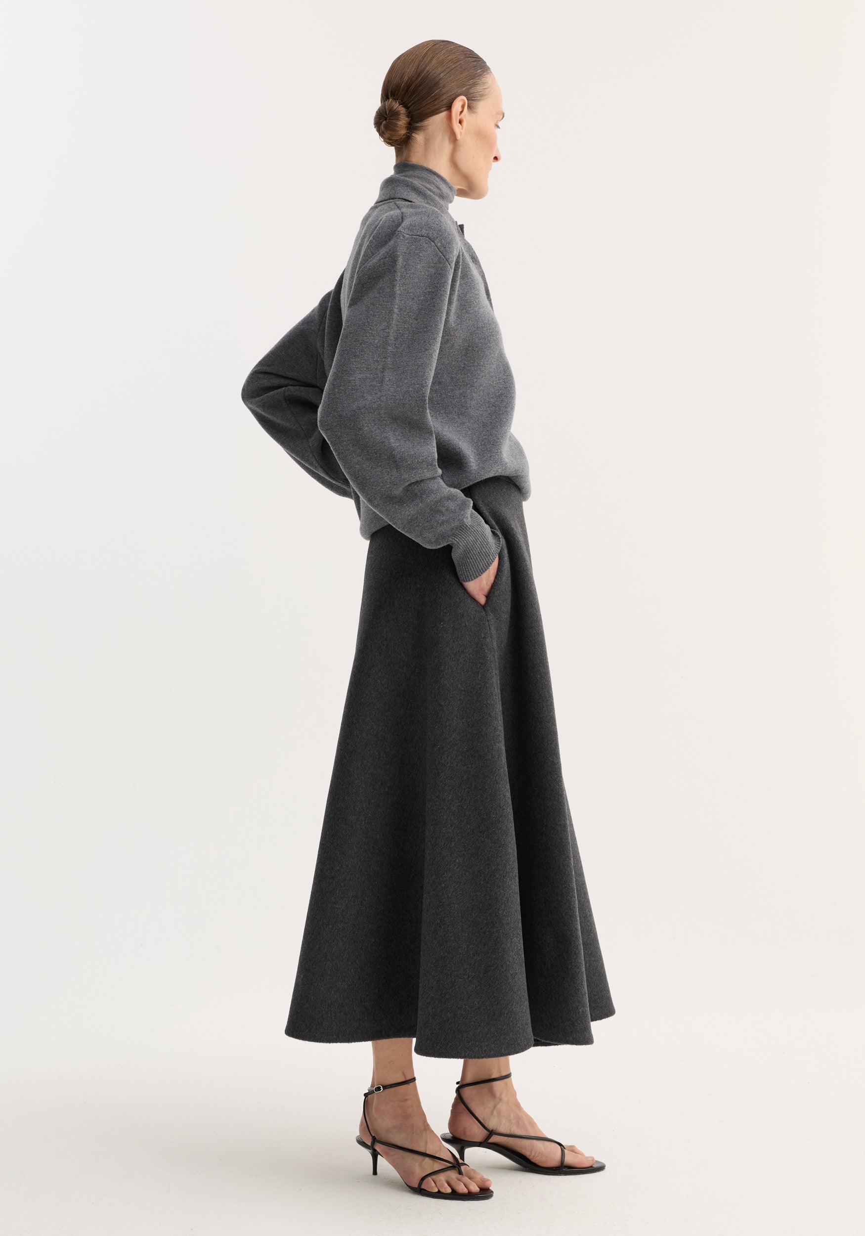 An exceptional voluminous A-line silhouette skirt, crafted from a recycled wool blend with a textured surface, it offers a soft touch. Style it with our grey melange V-neck jumper for a statement tonal look. This piece is part of our commitment to a more concious approach.
