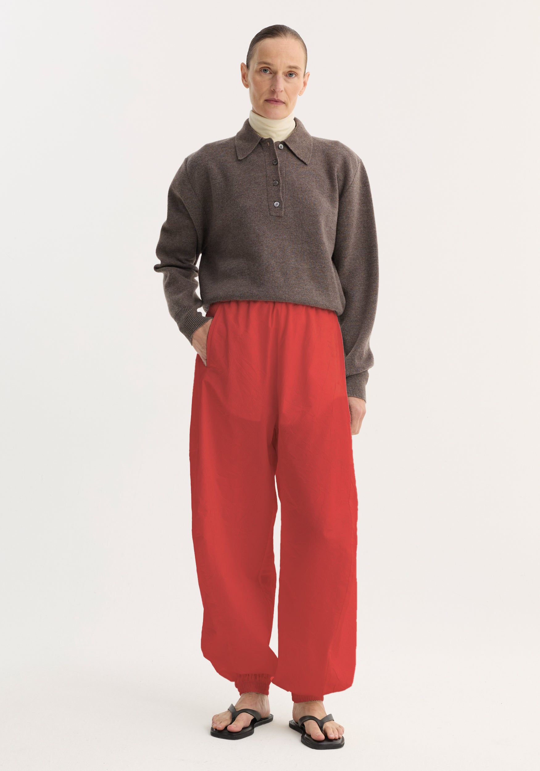 Balloon track pants cut in seasonal red. Designed with an elasticated waistband and hem that create a voluminous leg and finished with front welt pockets for a refined look.