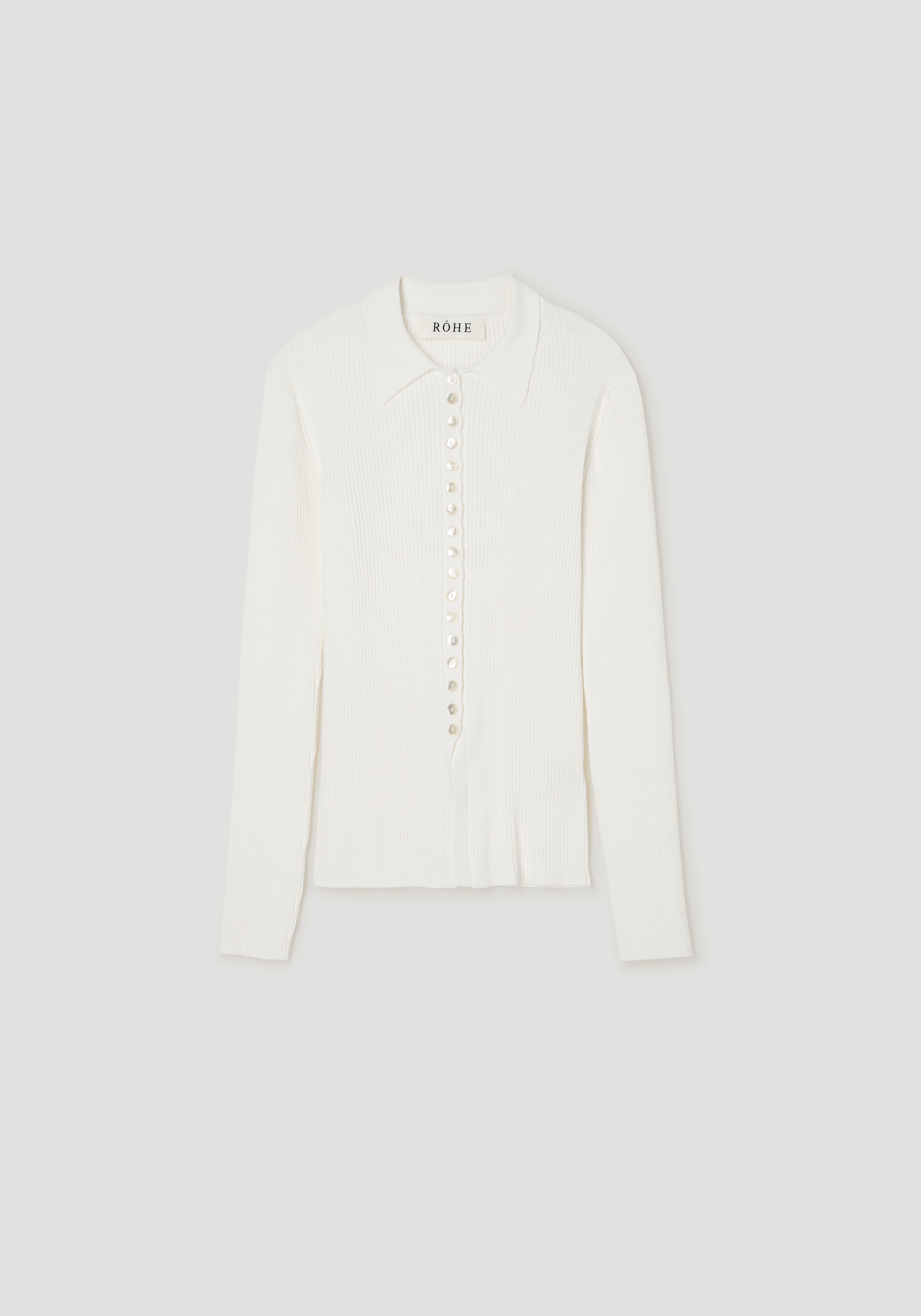 An elongated ribbed cardigan with a close-fitting silhouette, designed with a collar and front buttons that finish just below the waist to allow the hem to subtly flare.