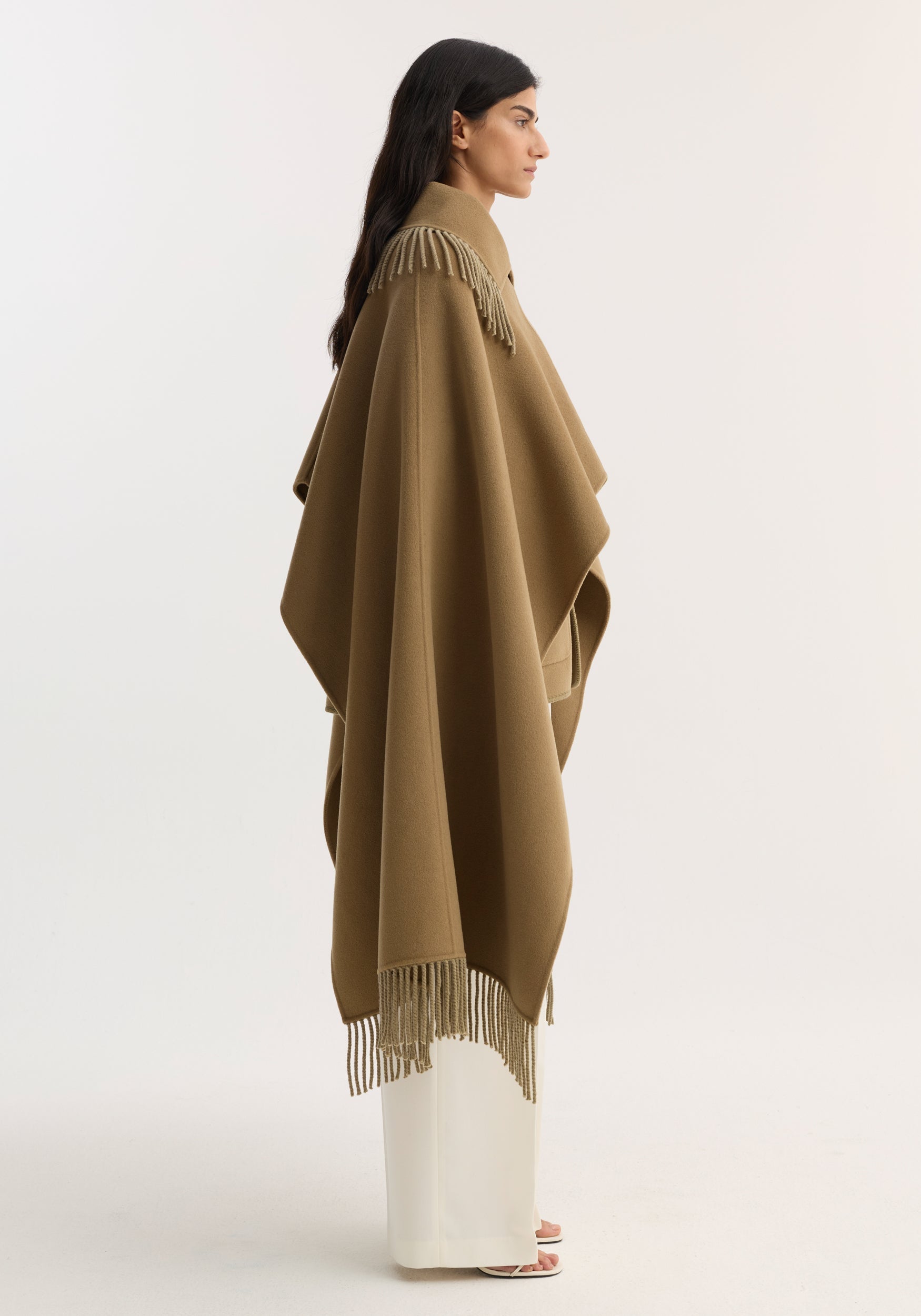 - Fringe trim, double-faced wool, open poncho design