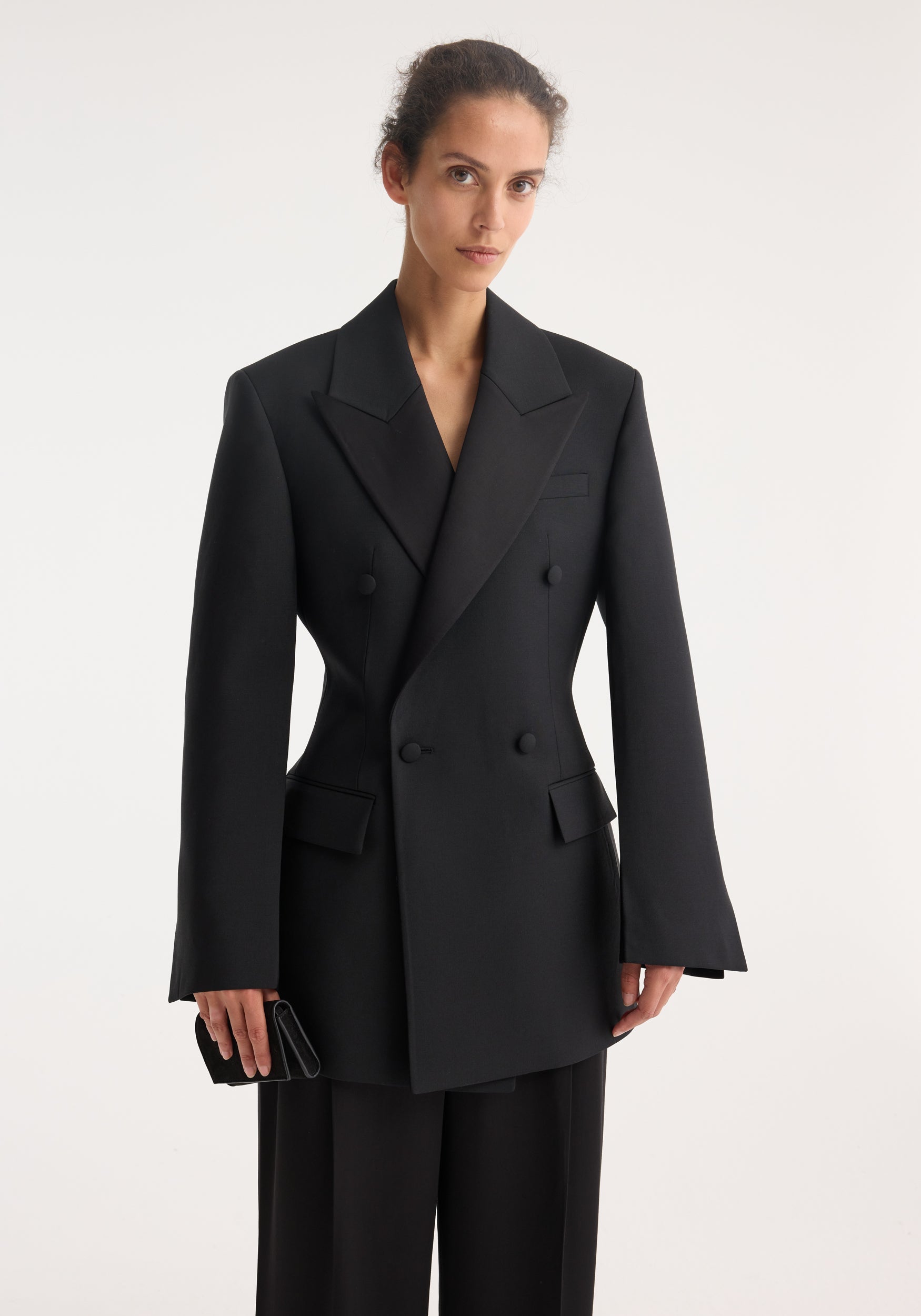 The hourglass blazer features a sharply cut notch lapel with satin detail and a beautifully architectural silhouette that cinches in at the waist and defines the shoulder. A sculptural take on classic tailoring designed for a structured yet feminine shape. This wool is woven by a renowned Italian mill specializing in premium tailoring fabrics, this lightweight wool-mohair blend is designed for structure, breathability, and lasting performance. Made with mulesing-free wool, it reflects our commitment to responsible sourcing.