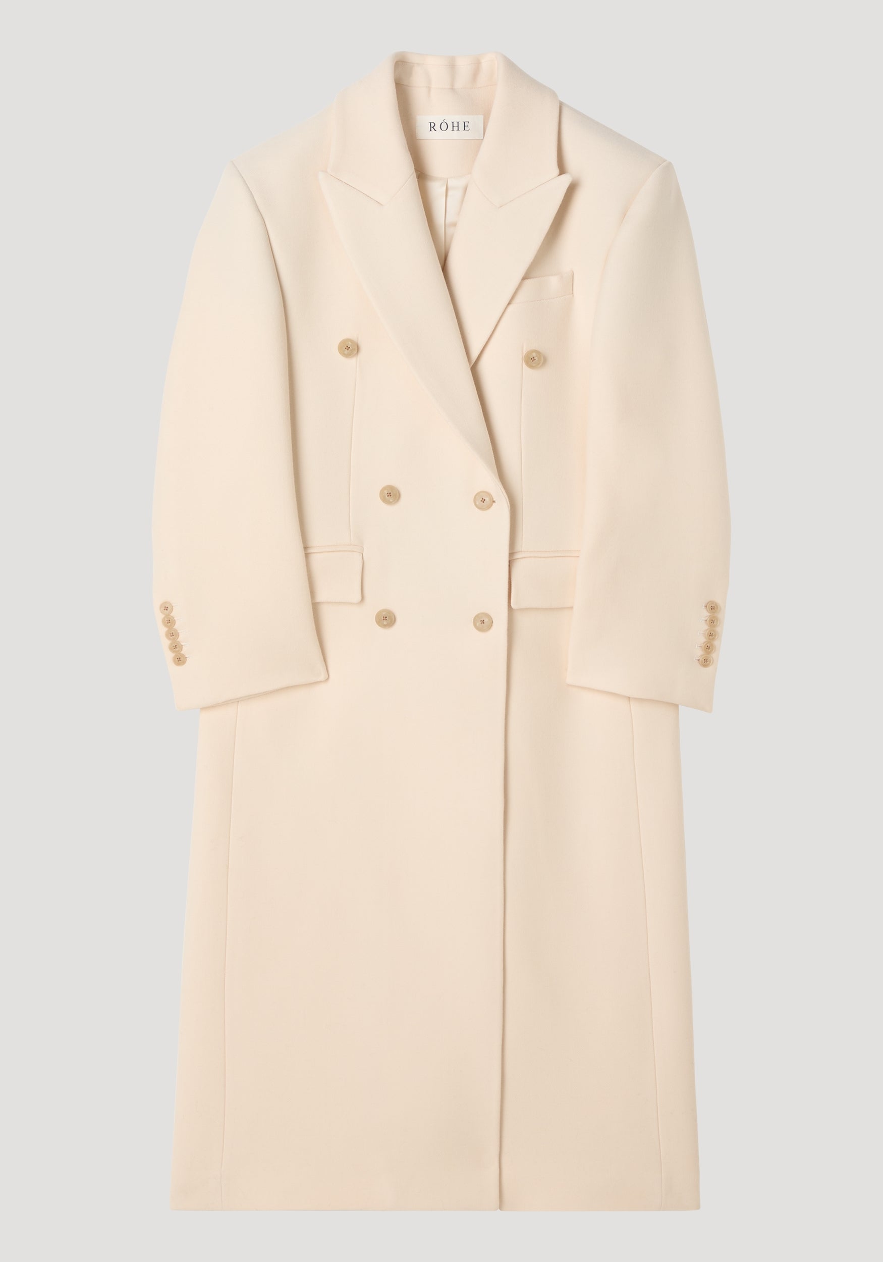 Our long-length double-breasted coat is cut to an hourglass silhouette with strong shoulders and a feminine waist. A structured staple in a clean off white pure wool fabric, designed to elevate cold-weather dressing.