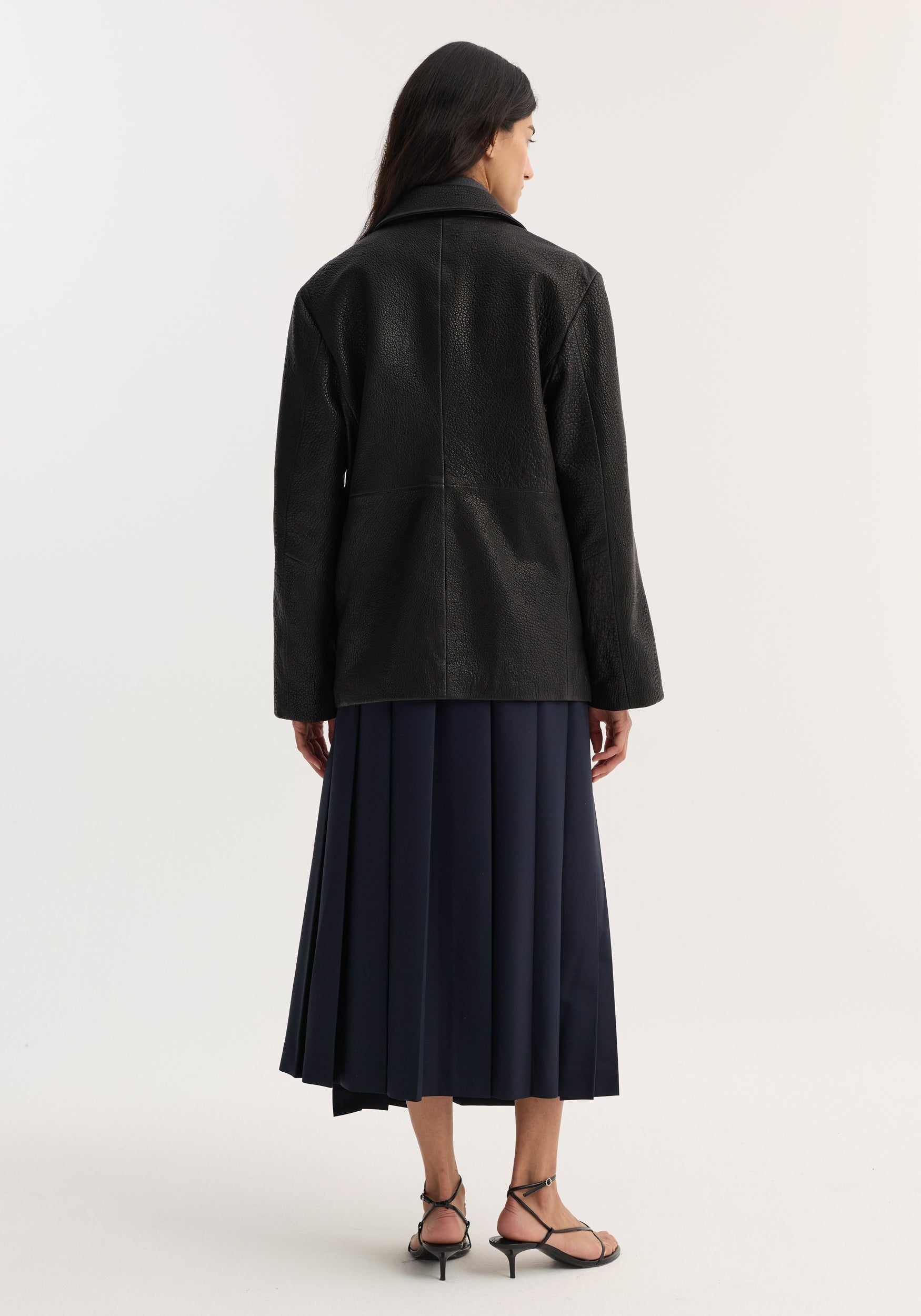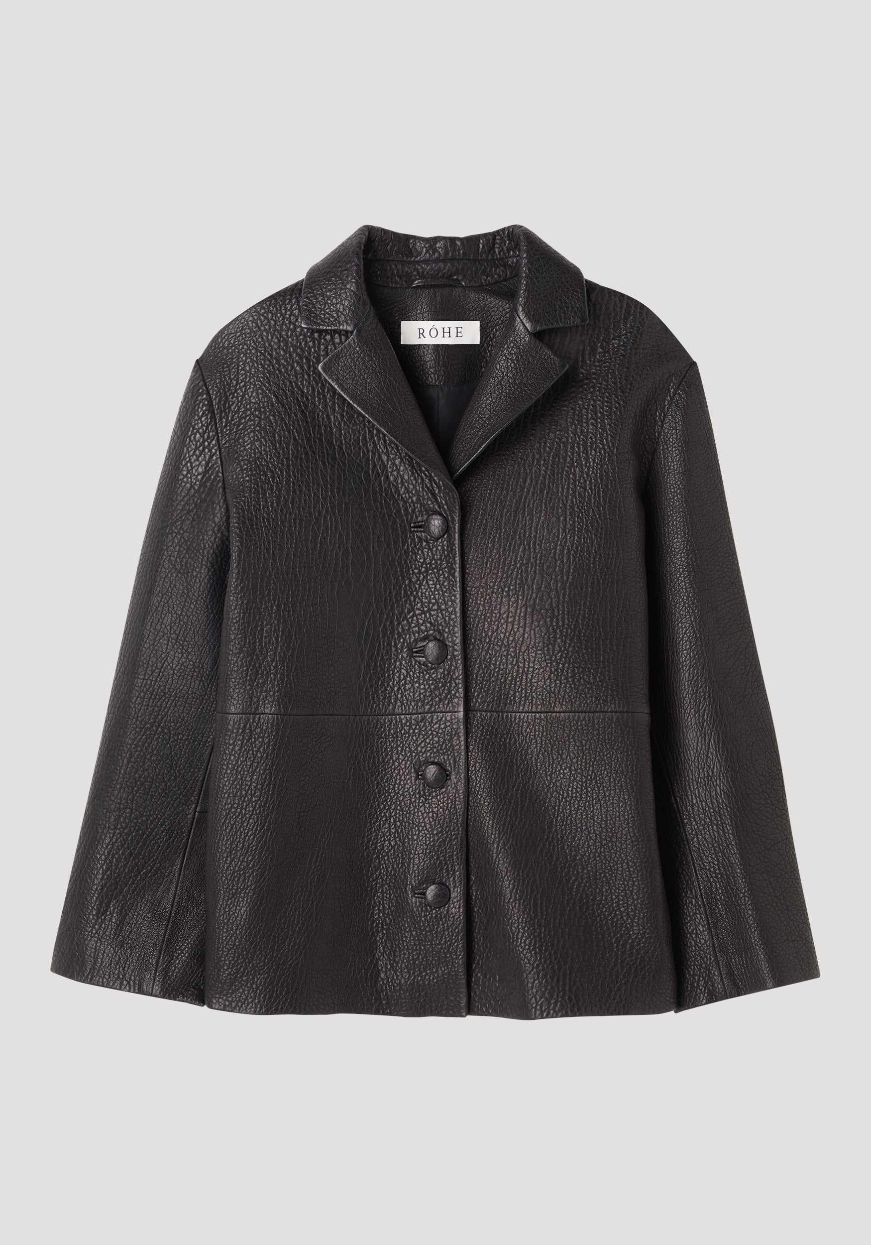 A straight-fit jacket with a subtly boxy silhouette, crafted from rich, heavy-grain leather. Fully lined and single-breasted, it features leather button closures, side-seam pockets, and small side splits for ease of movement.
