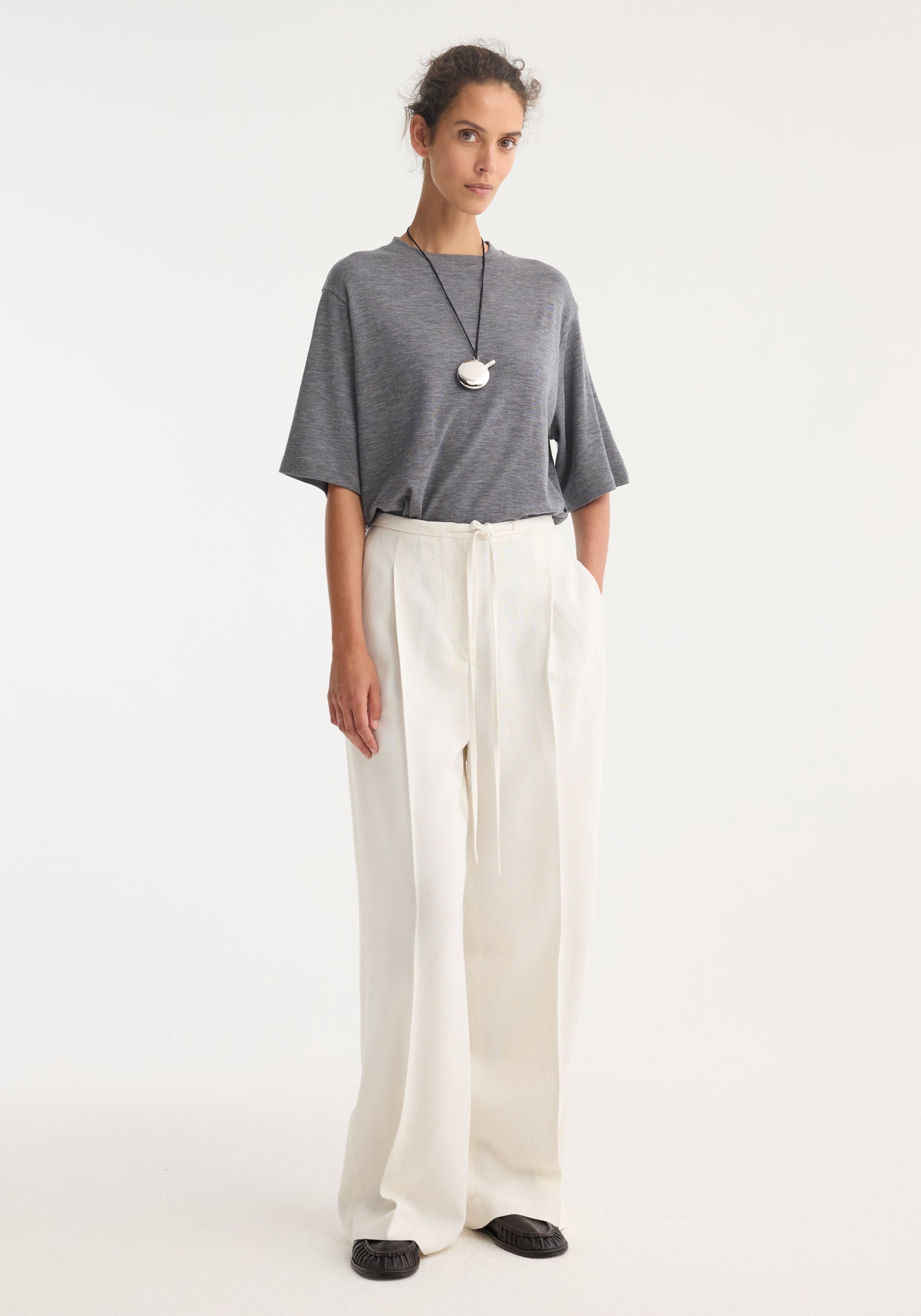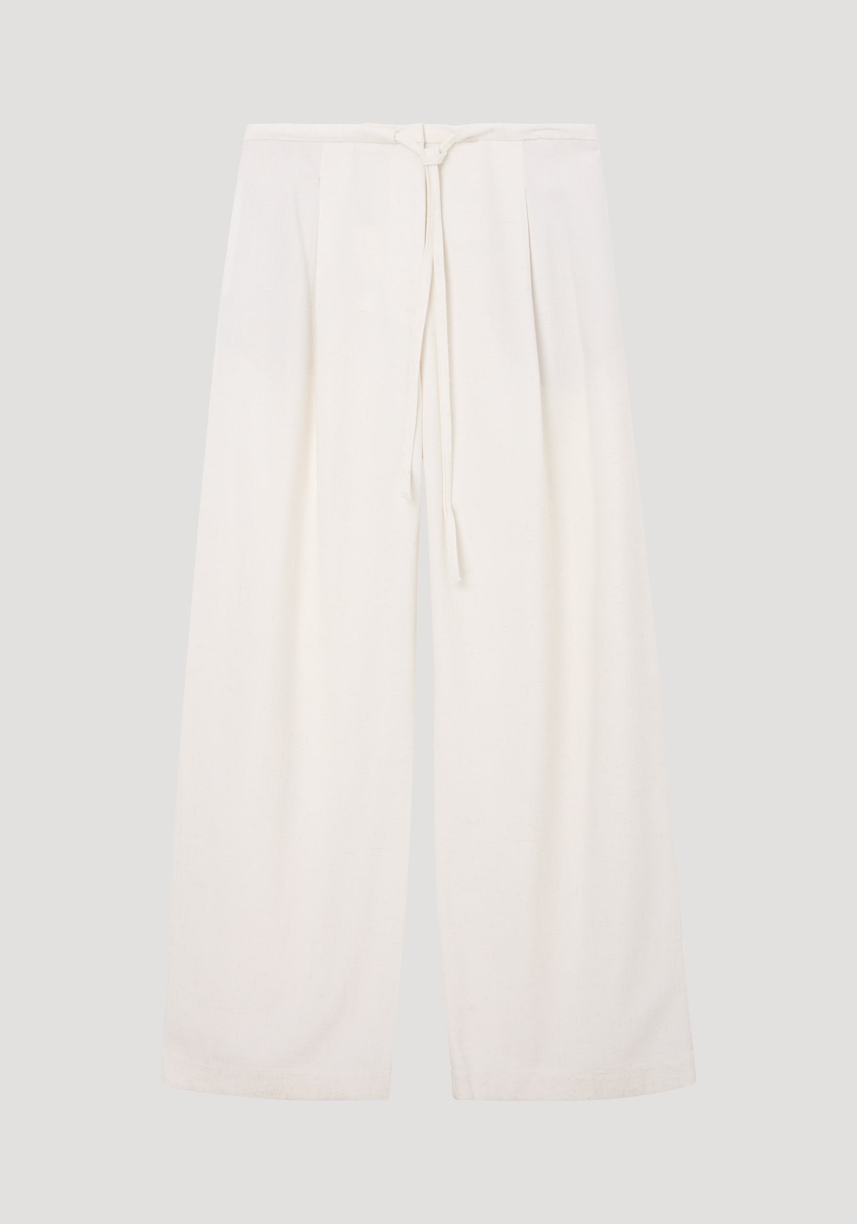 A relaxed fluid trouser crafted from a light silk blend fabric, enriched with a delicate texture and soft lustre. Designed with a wide leg silhouette and an elegant drawstring waistband for comfort and effortless movement. Understated tailoring for everyday ease.