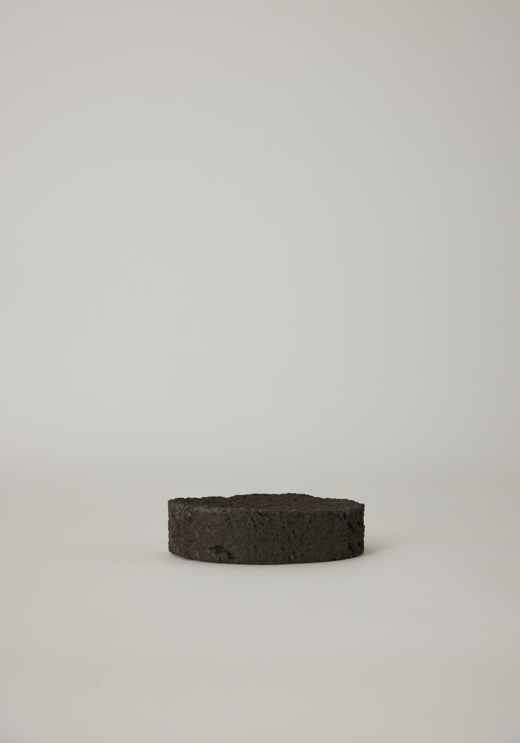 Small round tray with carved indent, handcrafted in the Netherlands by Dutch artist Louis Crombag from left-over lava stone. The measurements are 2 cm H x 13,5 cm W. The material is 100% lava stone.