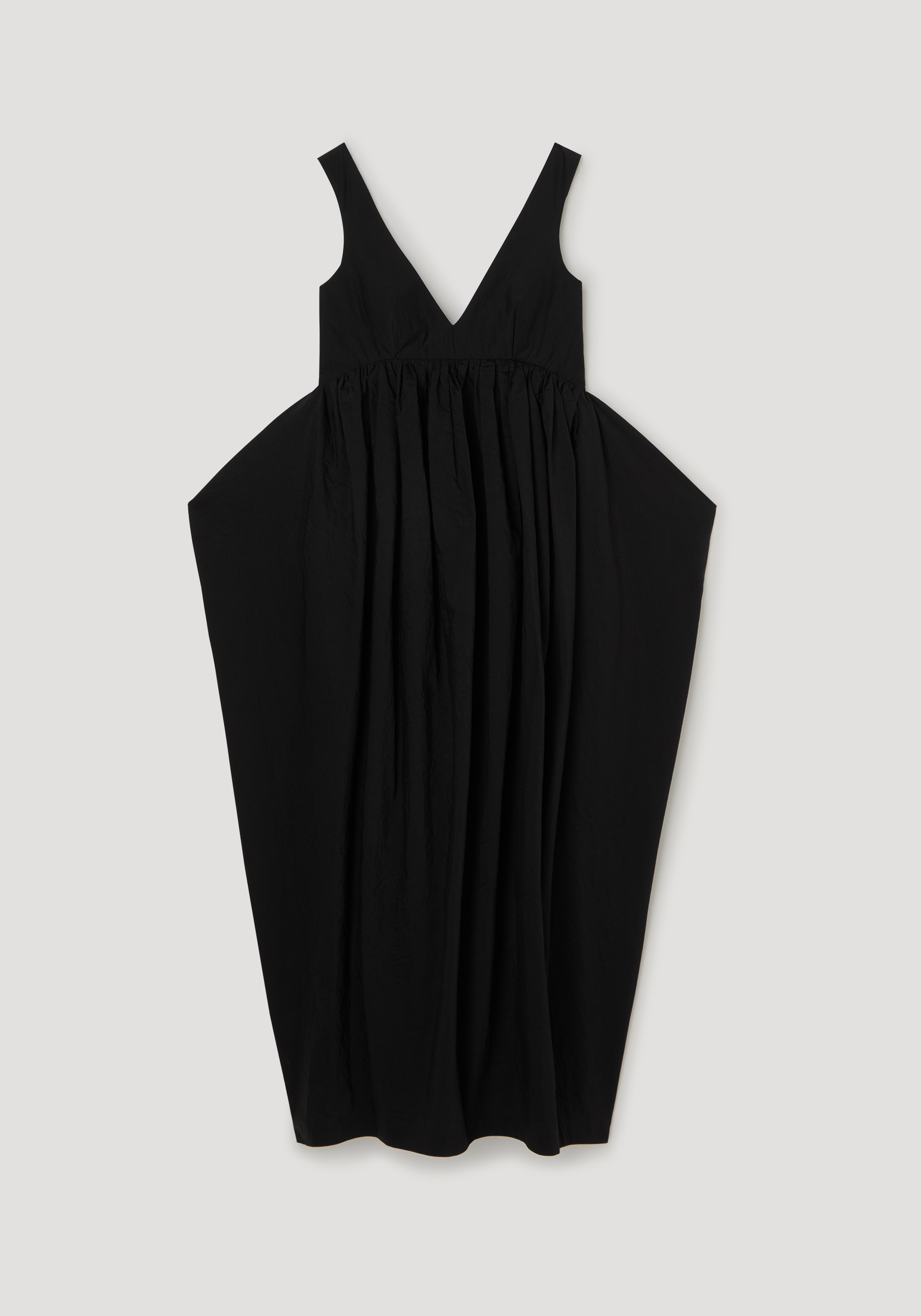 A summer dress crafted from textured cotton. With a v-neckline, and low back, the skirt gathers above the waist and and comes together at the hem to create volume and a trapezium shape through the skirt.