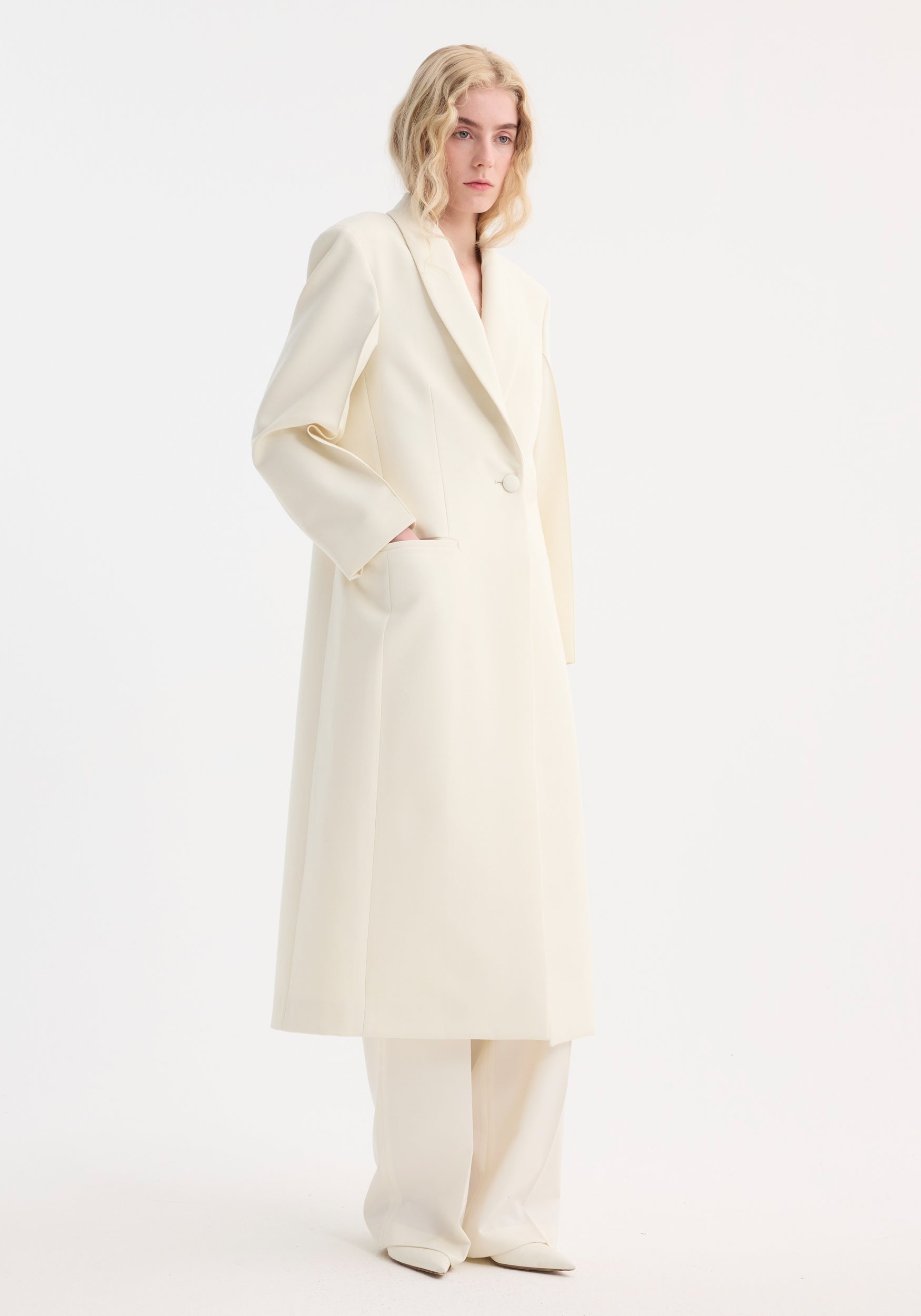 A timeless full-length tailored coat for elegant seasonal layering. A structured silhouette designed with double-breasted sleek lapels, a center back slit and welt pockets. This classic Opera coat offers a refined statement for any wardrobe.