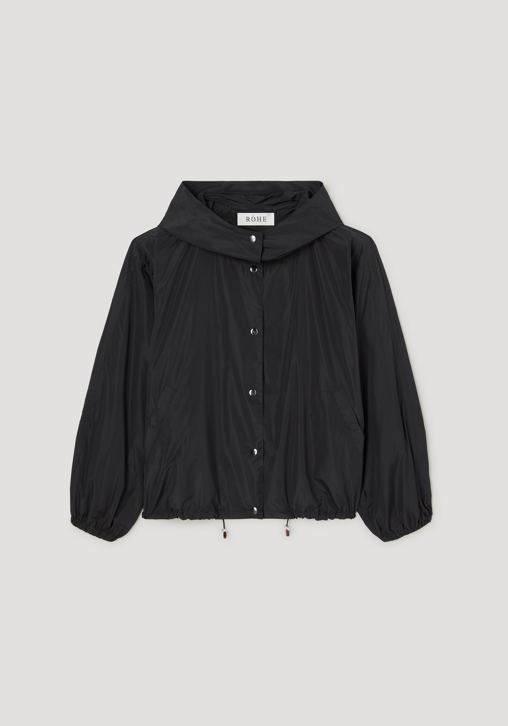 An oversized jacket crafted from a silk-blend fabric, designed with a generous hood and high collar. Finished with snap button closures, elasticated cuffs, and an adjustable hem, cut to finish at the hip.